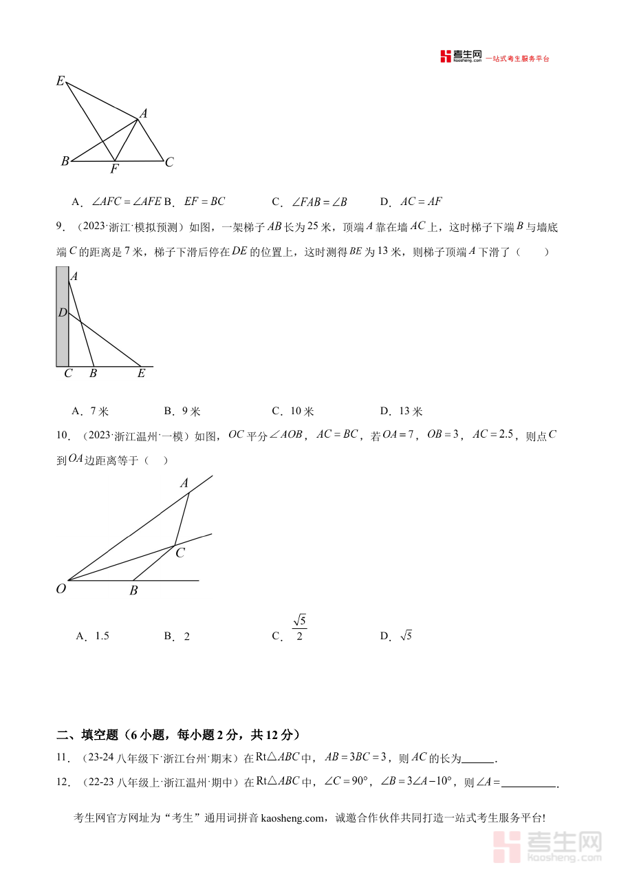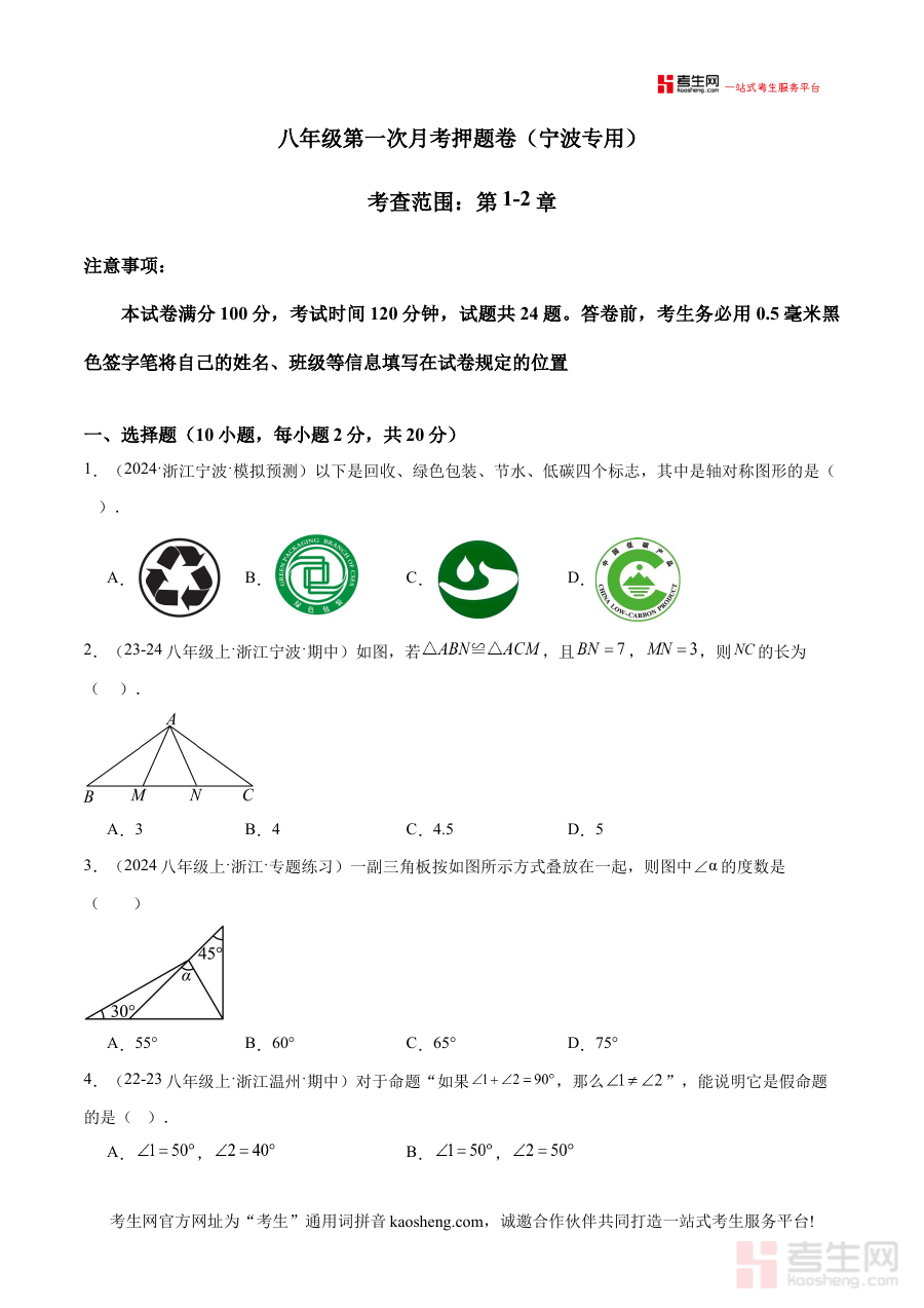 《八年级第一次月考押题卷(宁波专用)(考试范围:浙教版第1-2章)(原卷版)》是针对宁波地区八年级学生第一次月考设计的专用备考资料,其内容严格贴合浙教版教材第1-2章的考试范围,结合宁波本地教学进度与月考命题特点编制而成。作为原卷版押题卷,它旨在为学生提供与本地考试情境高度匹配的练习载体,帮助学生提前熟悉月考的考查方向与形式,是衔接课堂学习与阶段性考试的重要过渡资源。