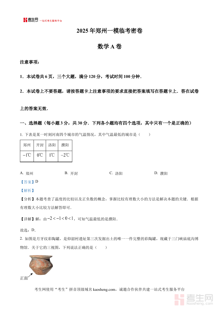 《精品解析:2025年河南省郑州市中考一模数学试题(解析版)》是针对2025年河南省郑州市初中毕业生中考前第一次模拟考试的数学学科专业备考资料,紧密贴合当地中考命题趋势与一模考试的阶段性测评特点,旨在通过系统的解析内容帮助使用者快速熟悉一模考试的整体框架与考查逻辑,为考生和教学工作者提供具有针对性的试题解析服务,助力把握该阶段数学学科的考查重点与方向。