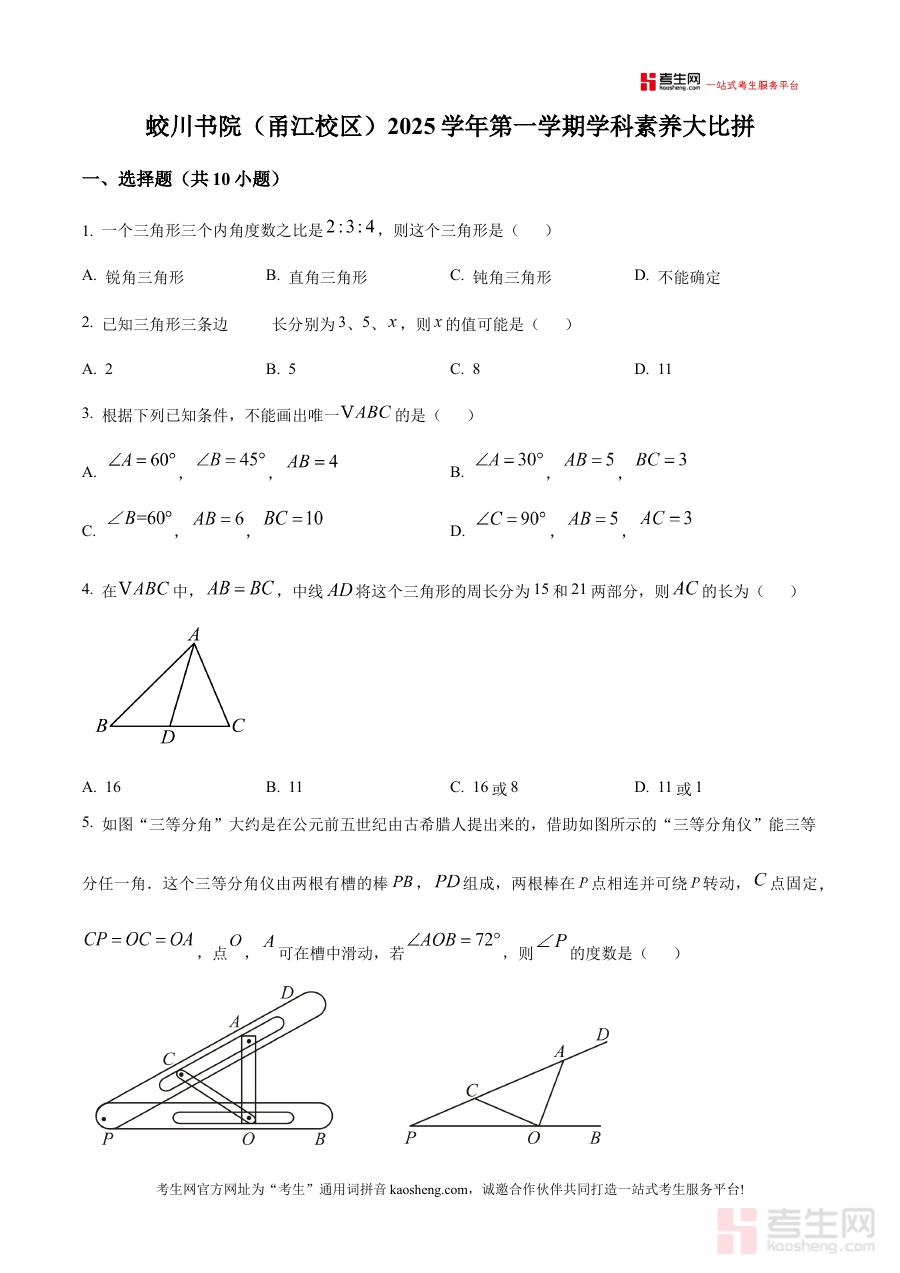 《精品解析:浙江省宁波市蛟川书院(甬真校区)2025-2026学年八年级上学期月考数学试卷(学科素养大比拼)(原卷版)》是面向浙江省宁波市蛟川书院甬真校区2025-2026学年八年级学生的数学月考备考资料,对应上学期阶段的学科素养考察需求,为学生提供贴合校区教学节奏与考试标准的练习资源。