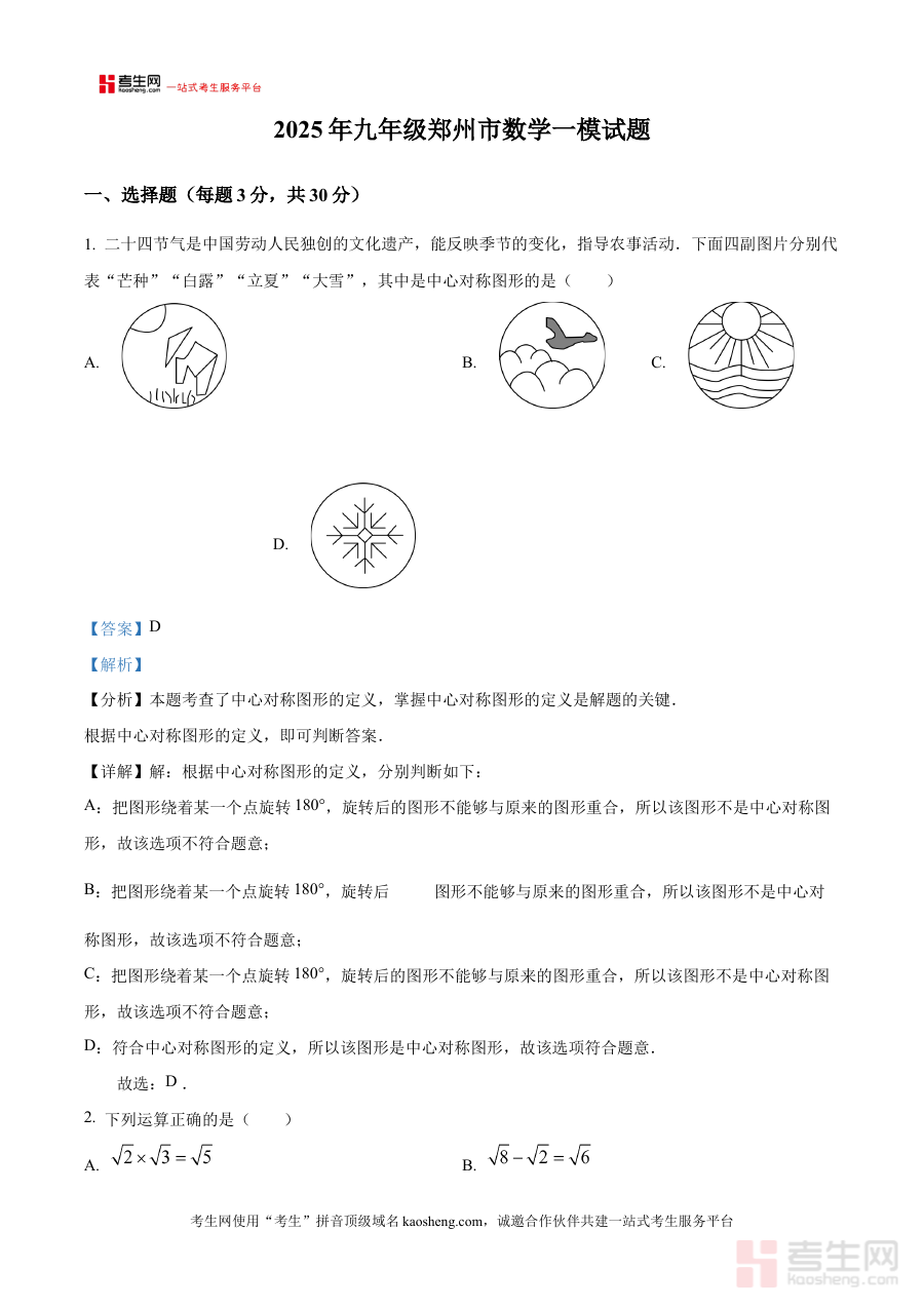 《精品解析:2025年河南省郑州市中考数学一模试题(解析版)》是针对2025年河南省郑州市初中毕业生学业水平考试数学学科第一次模拟测试编制的专业解析资料,紧密贴合当地中考数学命题特点与区域教学要求,为考生及教师提供与实际考试场景高度匹配的备考资源,助力使用者提前熟悉中考数学一模的考查形式与核心方向。
