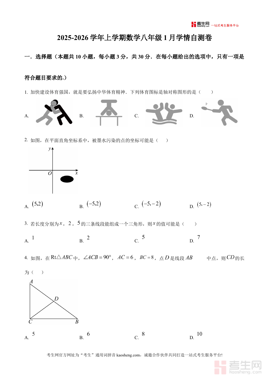 《精品解析:浙江奉化市锦屏中学2025-2026学年上学期数学八年级1月学情自测卷(原卷版)》是针对浙江奉化市锦屏中学特定学年学期与年级的数学学情自测资料,聚焦2025-2026学年上学期八年级学生1月的数学学习情况检测,属于该阶段数学学科备考与学习评估的重要参考资料,能够为相关使用者提供贴合本地本校教学实际的测试内容载体。