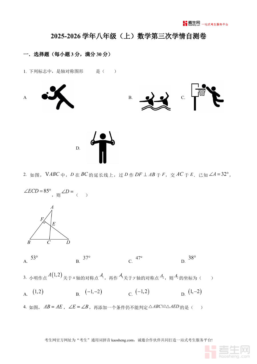 《精品解析:浙江奉化市锦屏中学2025-2026学年八年级上学期数学第三次学情自测卷(原卷版)》是浙江奉化市锦屏中学针对2025-2026学年八年级上学期数学学科设计的第三次学情自测卷原卷版本,属于阶段性学情检测类备考资料,它精准对应该校八年级上学期数学教学进度,能够为师生提供反映该阶段数学学习真实状况的原始检测载体,帮助师生直观了解当前学习阶段的知识掌握情况。