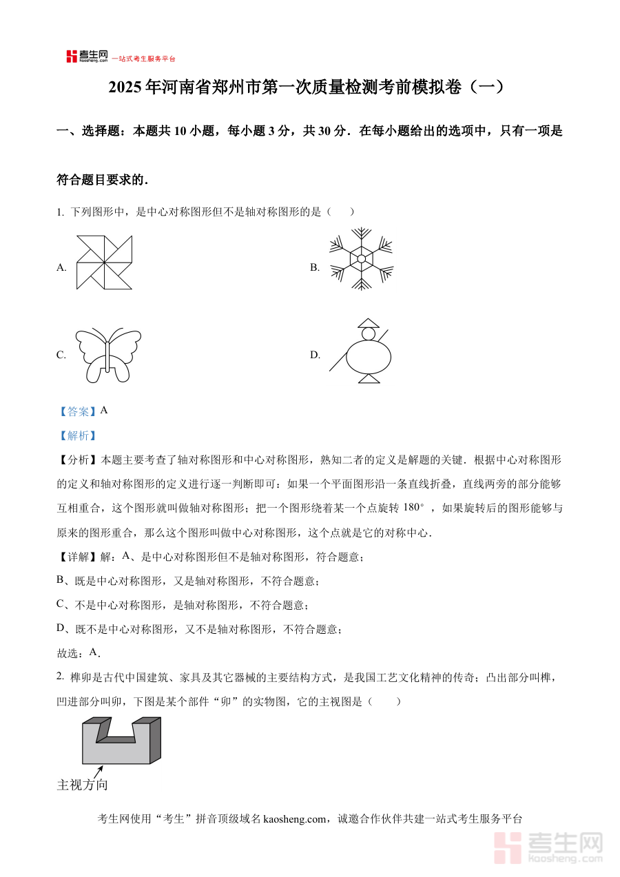 此资料适用于2025届河南省郑州市九年级数学考生、一线数学教师及备考指导人员,通过模拟检测与详细解析的结合,既能让考生提前熟悉考试流程与题型结构,提升应试技巧与解题效率,也能为教师提供教学参考案例,共同推动备考工作的针对性与有效性,为第一次质量检测的顺利应考奠定基础。