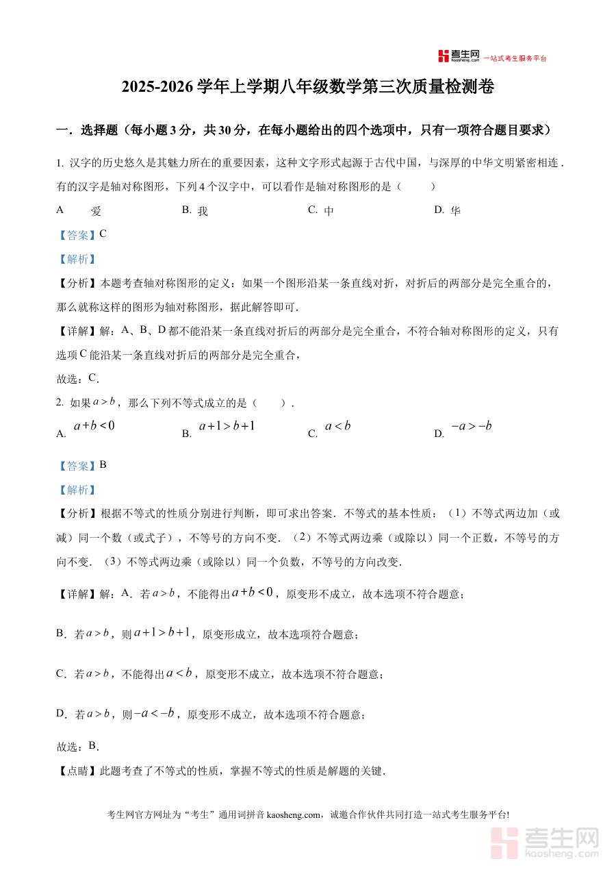 《精品解析:浙江宁波市镇海区仁爱学校2025-2026学年上学期八年级数学第三次质量检测卷(解析版)》是针对浙江宁波市镇海区仁爱学校特定学年学期、特定年级学科及特定检测次数的数学考试解析类备考资料。该资料对应2025-2026学年上学期的八年级数学第三次质量检测,明确聚焦于该校该阶段的数学学习成果检测场景,为相关使用者提供与考试直接匹配的解析内容支持,确保资料的针对性与适用性。