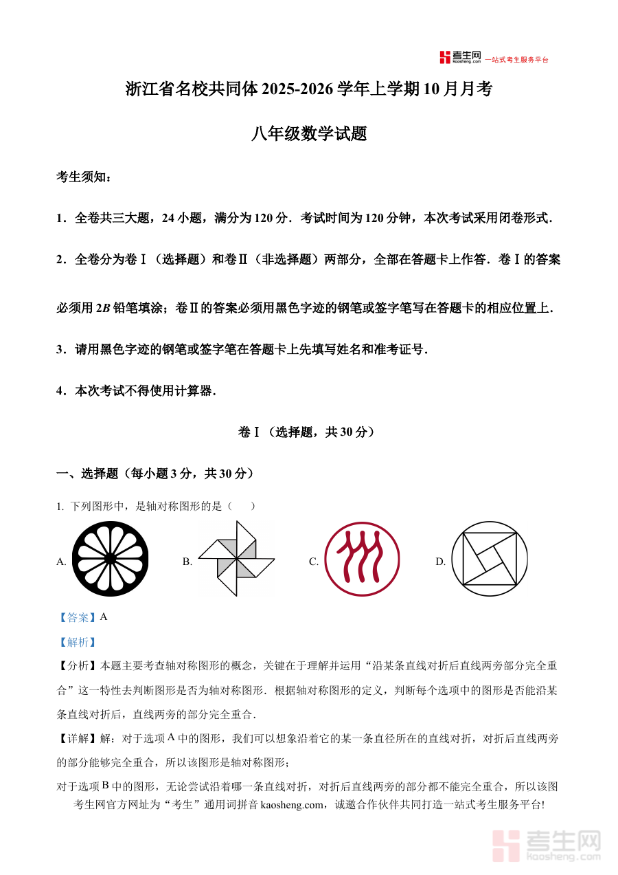 《精品解析:浙江省名校共同体2025-2026学年上学期10月月考八年级数学试题(解析版)》是针对浙江省名校共同体在2025-2026学年上学期10月组织的八年级数学月考所编制的备考资料,聚焦该阶段数学学习成果的检测需求,为使用者提供与本次考试直接相关的专业解析内容。