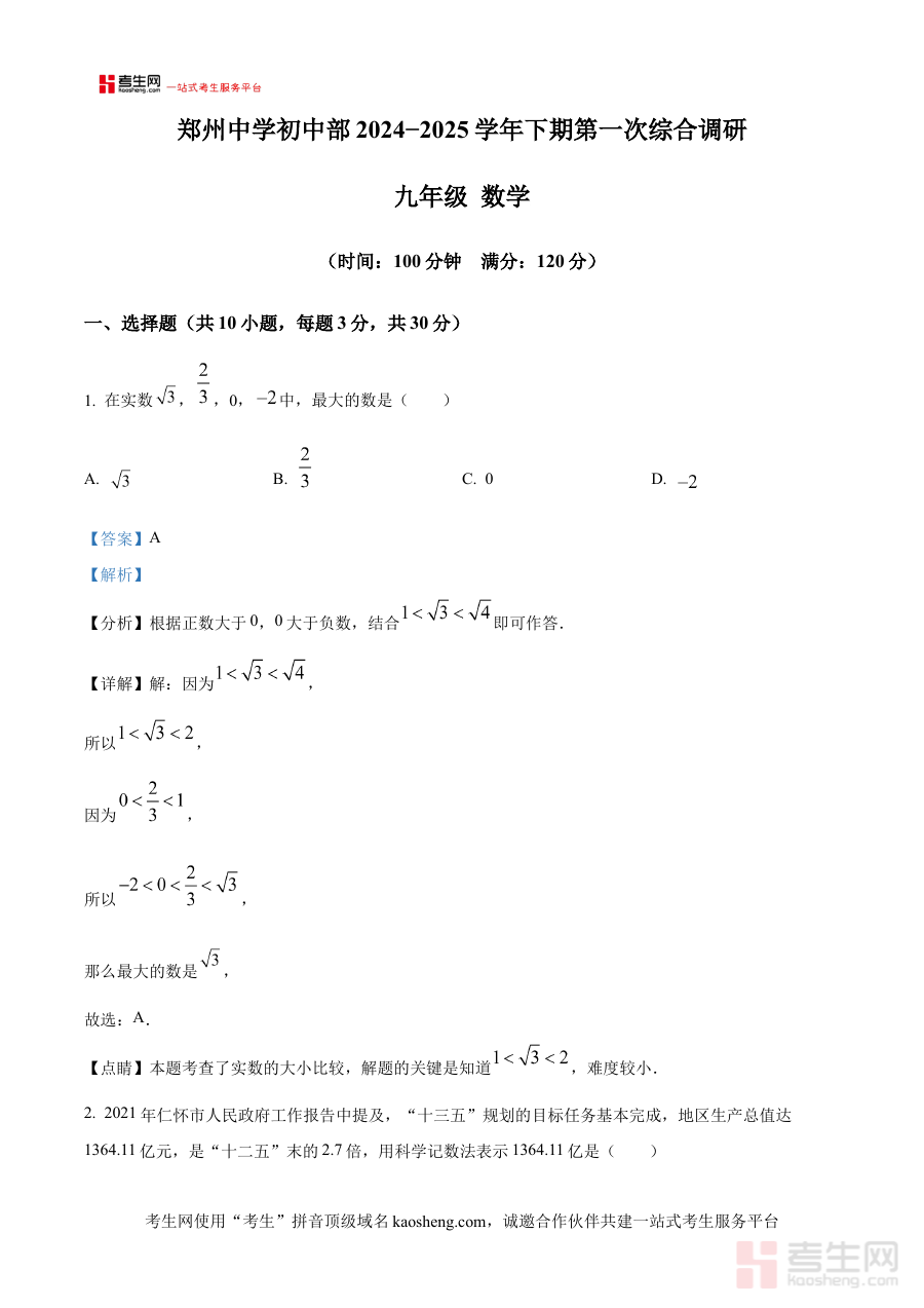 《精品解析:河南省郑州中学初中部2024—2025学年下学期第一次综合调研九年级数学试题(解析版)》是针对河南省郑州中学初中部九年级学生在2024—2025学年下学期开展的第一次综合调研数学考试的配套解析类备考资料,其内容与该阶段教学进度及调研考试要求紧密贴合。