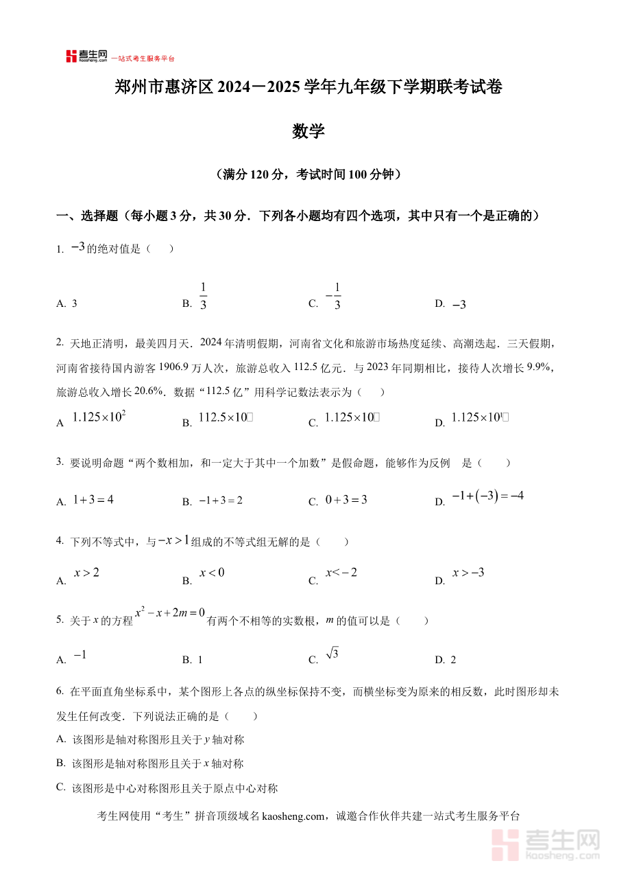 《精品解析:河南省郑州市惠济区2024-2025学年九年级下学期第一次联考数学试题(原卷版)》是针对河南省郑州市惠济区2024-2025学年九年级下学期第一次联考的数学学科备考资料,聚焦该地区特定学年阶段的联考场景,为相关师生提供与本地考试节奏适配的学习参考依据。