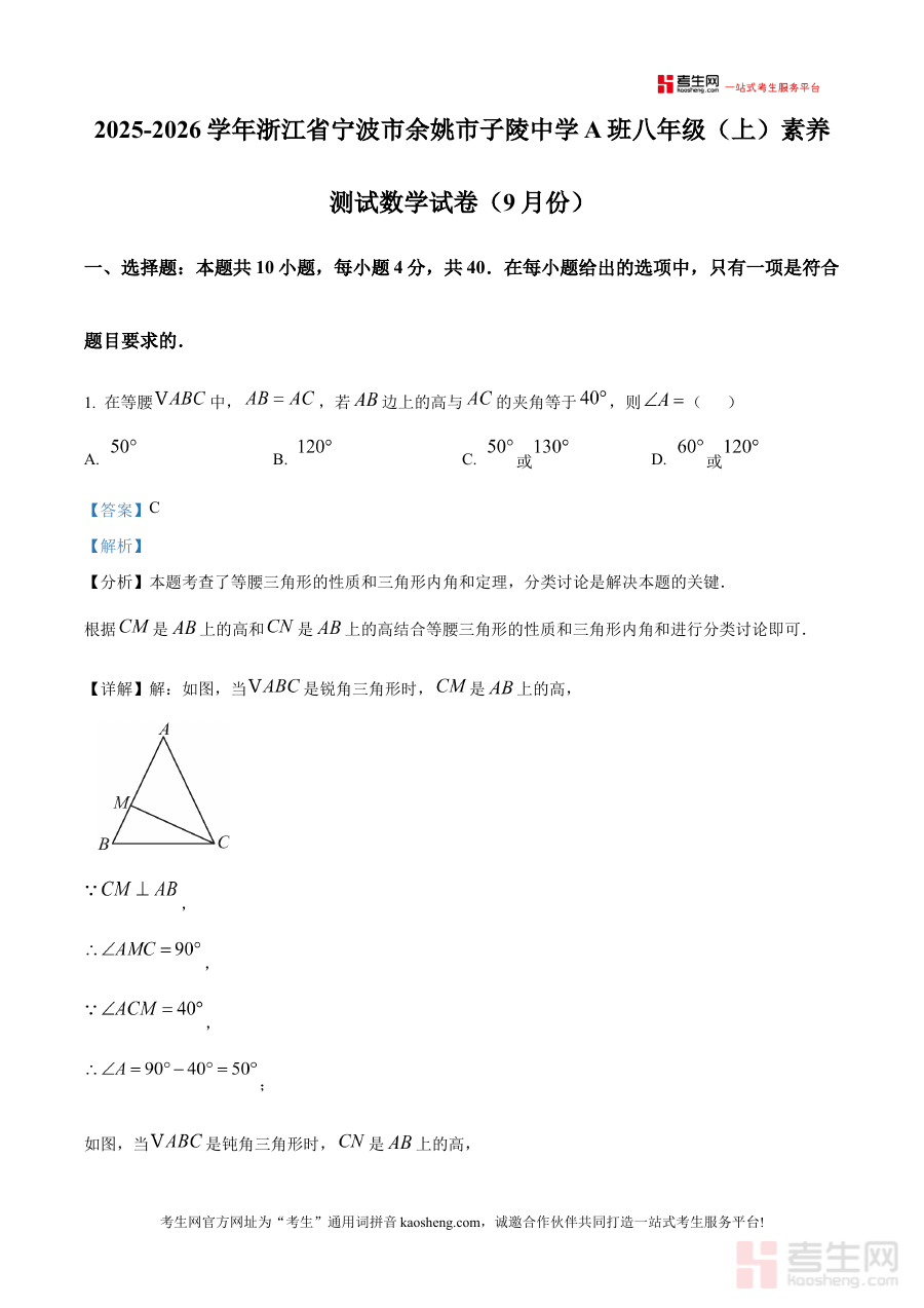 《精品解析:浙江省宁波市余姚市子陵中学2025-2026学年八年级上学期素养测试数学试卷(9月份)(解析版)》是针对浙江省宁波市余姚市子陵中学2025-2026学年八年级上学期9月份素养测试的数学学科备考资料,精准对应该阶段学校组织的素养测试场景,为学生提供贴合本地校考实际的学习参考。