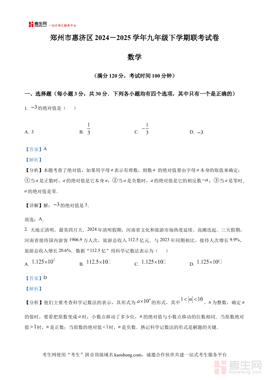 本资料适用于河南省郑州市惠济区2024-2025学年九年级学生进行数学联考备考,也可为该地区初中数学教师提供教学参考与学情分析依据,其解析内容有助于学生巩固阶段知识、熟悉联考题型特点,为后续中考备考奠定基础。