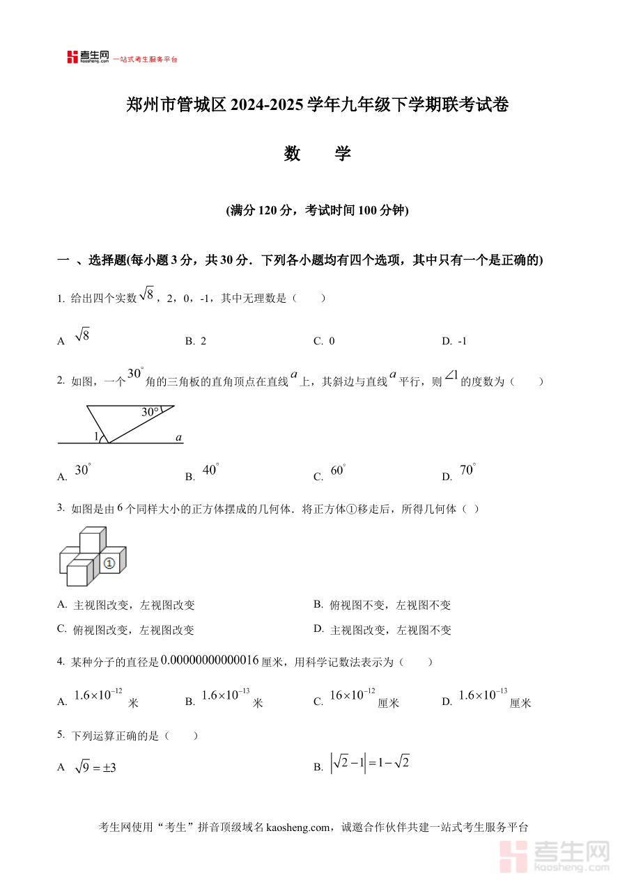 《精品解析:河南省郑州市管城区2024-2025学年九年级下学期第一次联考数学试题试卷(原卷版)》是针对河南省郑州市管城区特定学年段与考试类型的数学学科备考资料。该资料对应2024-2025学年九年级下学期的第一次区域联考,作为原卷版试卷,它直接呈现了此次联考的原始命题形式与考查框架,能够真实反映管城区该阶段数学教学的阶段性评估方向,为相关师生提供贴合本地教学实际的备考参考载体。
