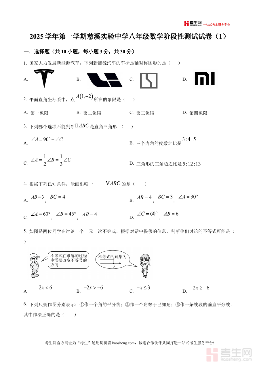 《精品解析:浙江省宁波市慈溪市实验中学2025-2026学年八年级上学期月考数学试卷(原卷版)》是面向浙江省宁波市慈溪市实验中学2025至2026学年八年级学生的上学期数学月度考试配套备考资料,精准对应该校该学年该阶段的教学进度与月度检测需求,为师生提供与实际考试场景高度贴合的原始试卷素材,是了解本次月考形式与内容框架的重要参考依据。