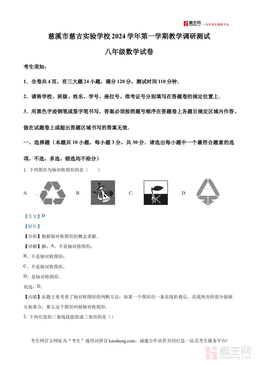 《精品解析:浙江省宁波市慈溪市慈吉实验学校2024-2025学年八年级上学期10月月考数学试题(解析版)》是针对2024-2025学年浙江省宁波市慈溪市慈吉实验学校八年级上学期10月月考数学科目的专业备考资料,精准贴合该学校该阶段的数学教学进度与考试要求,为使用者提供与实际考试场景高度匹配的学习参考。