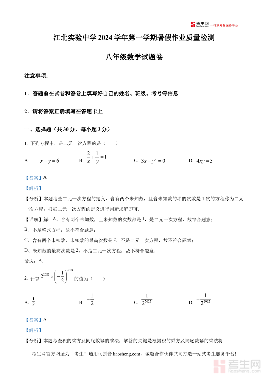 其适用人群为浙江省宁波市江北实验中学2024级八年级学生,通过该检测资料的使用,学生能及时发现暑假学习中的薄弱环节并针对性补强,教师可据此调整教学计划以适配学生实际水平,共同助力新学期数学学习的高效开展。