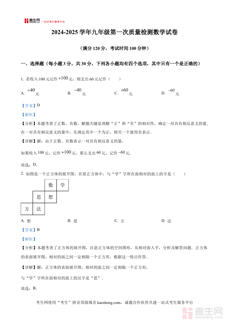 本资料适用于河南省郑州市高新区2024-2025学年九年级师生,尤其适合需要针对第一次质量检测进行复盘总结、提升数学应试能力的学生,以及需要参考解析优化教学策略的教师,其解析内容可帮助使用者明确知识薄弱点,提升阶段备考的针对性与有效性。