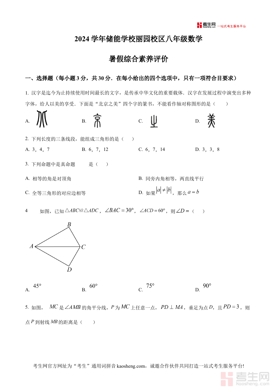 《精品解析:浙江省宁波市海曙区储能学校丽园校区2024-2025学年八年级上学期开学数学试题(原卷版)》是面向浙江省宁波市海曙区储能学校丽园校区2024至2025学年八年级学生的开学数学考试备考资料,精准对应该校区特定学年的开学阶段数学学科检测场景,为师生提供与校区教学实际相契合的考试资料支持。