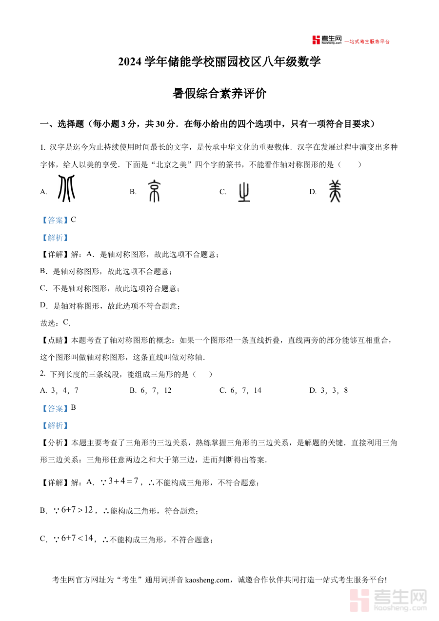 《精品解析:浙江省宁波市海曙区储能学校丽园校区2024-2025学年八年级上学期开学数学试题 (解析版)》是针对浙江省宁波市海曙区储能学校丽园校区2024-2025学年八年级上学期开学数学考试的专业备考资料,明确对应特定校区、学年及学段的开学数学考试场景,为相关教学活动及学习准备提供针对性支持。