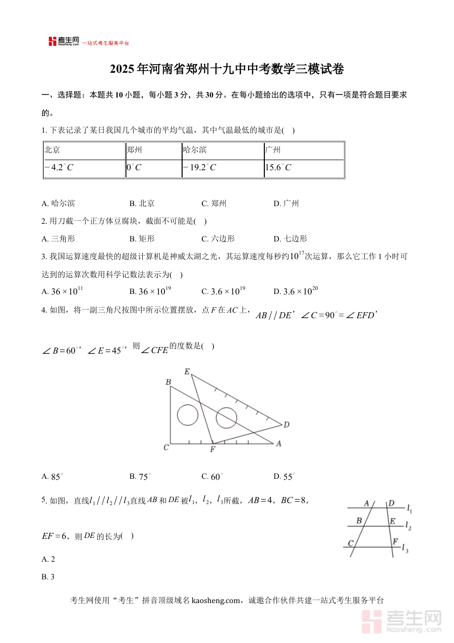 《2025年河南省郑州市第十九初级中学中考数学三模试卷》是2025年度面向河南省郑州市第十九初级中学初三学生编制的中考数学模拟测试资料。作为中考前的第三次模拟试卷,它紧密贴合当地中考数学的备考进度与要求,旨在为学生提供阶段性的能力评估载体,是该校中考数学备考体系中的重要组成部分。