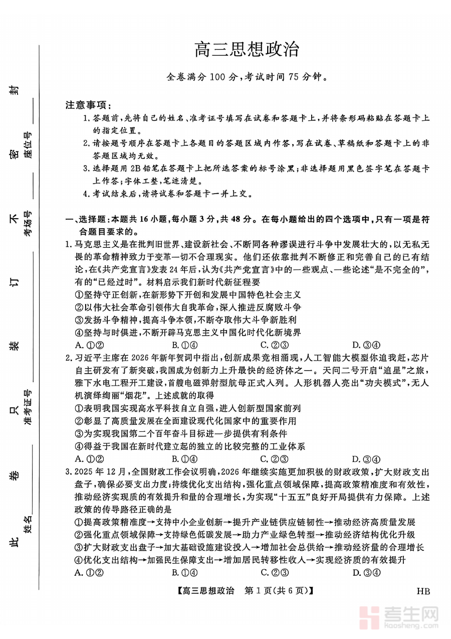 该试卷的核心用途在于支持学情诊断与备考规划,教师可通过分析学生的答卷情况,精准识别学生在政治学科知识掌握、能力应用等方面的薄弱环节,进而调整教学策略与复习重点;学生也能通过完成试卷了解自身在知识点理解、答题技巧等方面的不足,明确后续复习方向,提升备考的针对性与有效性。此外,它还可作为学校评估教学质量、优化备考方案的重要依据之一。