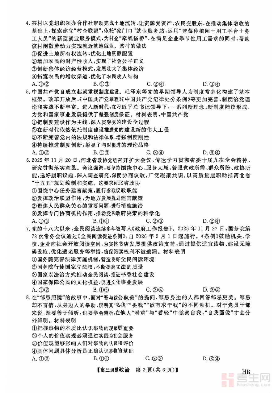 《河北邯郸高三上学期金科联考二月份政治试卷》是针对河北省邯郸市高三学生的阶段性联考资料,属于高三上学期末期的重要检测工具。该试卷依托当地教育教学实际和金科联考的组织标准,旨在客观反映高三学生在政治学科上的阶段性学习成果,为后续高考备考提供真实可靠的参考依据。作为区域协同性的检测资料,它能够体现当地高三政治教学的整体水平与学生的学习状况,具有较强的针对性和区域适配性。