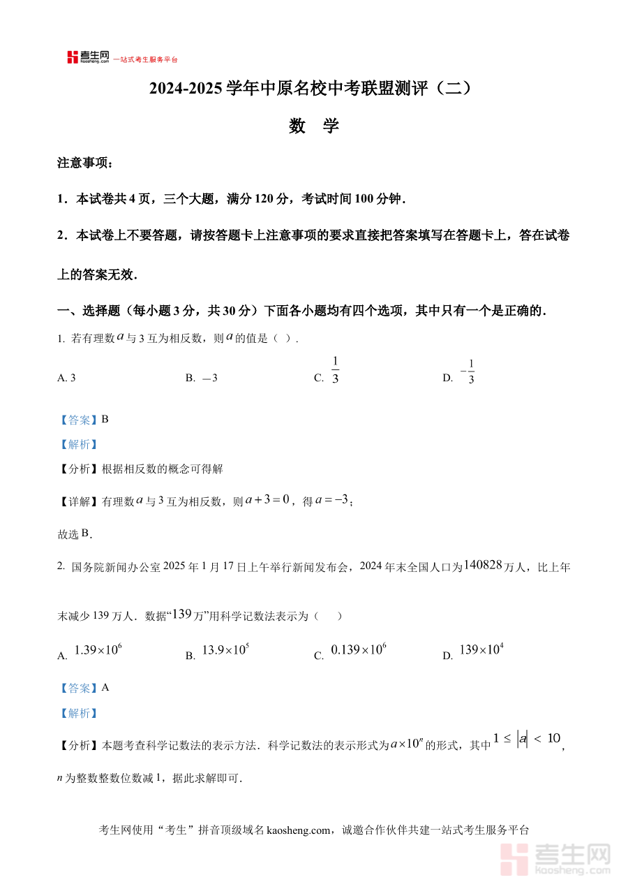 《精品解析:2025年河南省中原名校联盟中考二模考试数学试题(解析版)》是2025年河南省中原名校联盟针对中考二模阶段推出的数学备考资料,聚焦河南省中考数学的命题规律与本地教学实际。该资料依托联盟内多所优质学校的教学经验与资源,以二模考试为载体,为考生提供贴合中考备考进度的阶段性学习支持,帮助考生提前适应二模考试的难度与题型设置方向。