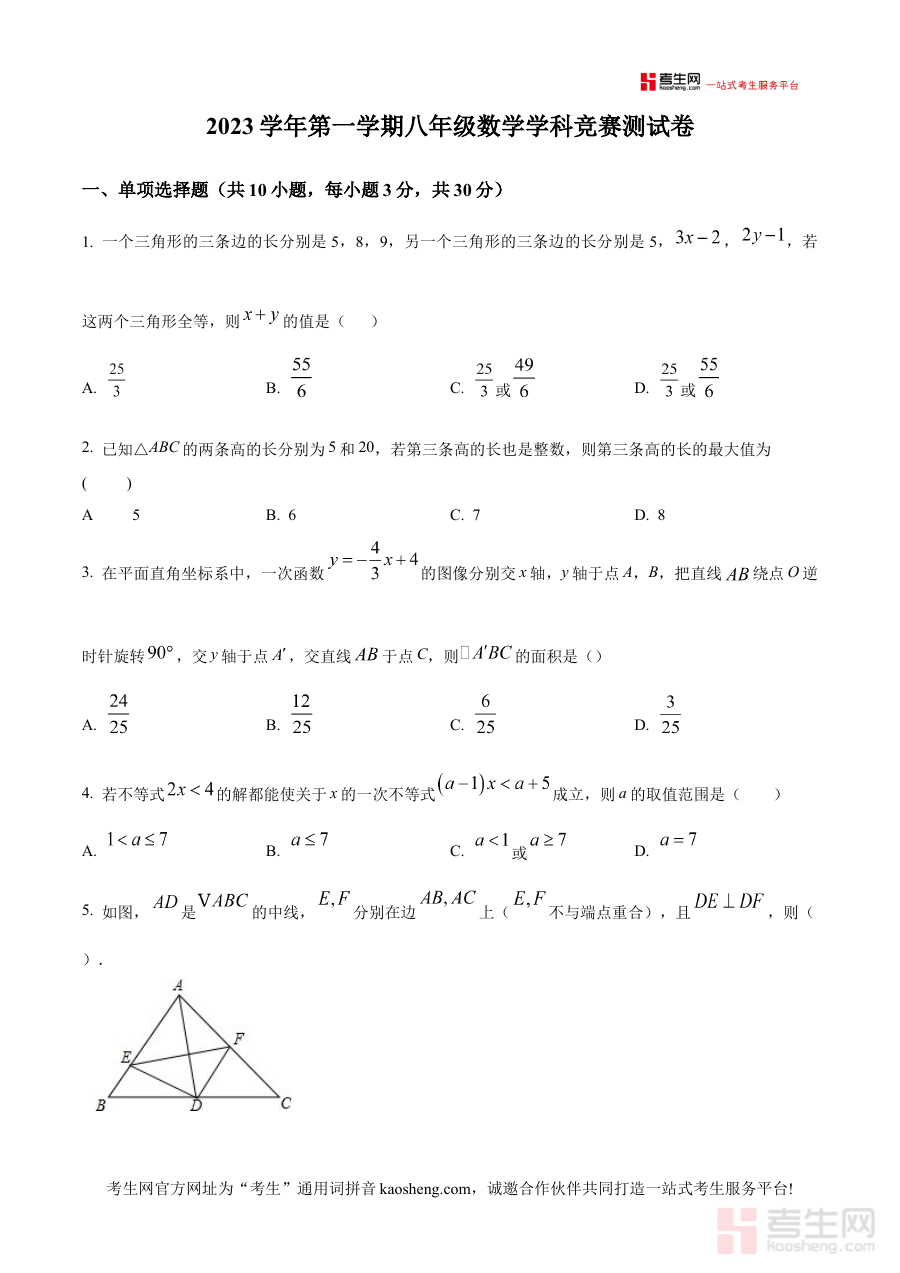 该资料可用于八年级学生数学竞赛备考过程中的阶段检测,帮助师生掌握当前竞赛知识的掌握程度,为后续备考规划提供数据支撑,同时也能作为校际间竞赛水平参照的实用材料。