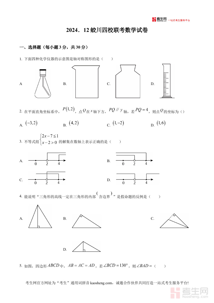 《精品解析:浙江省宁波市镇海蛟川书院等四校2024--2025学年八年级上学期12月联考数学试卷(原卷版)》是针对浙江省宁波市镇海蛟川书院及其他三所学校联合举办的2024-2025学年八年级上学期12月数学联考的备考资料,聚焦该阶段数学学科的阶段性考试需求,为相关师生提供贴合本地校际联考实际的原卷资源。