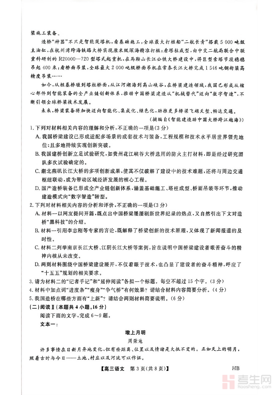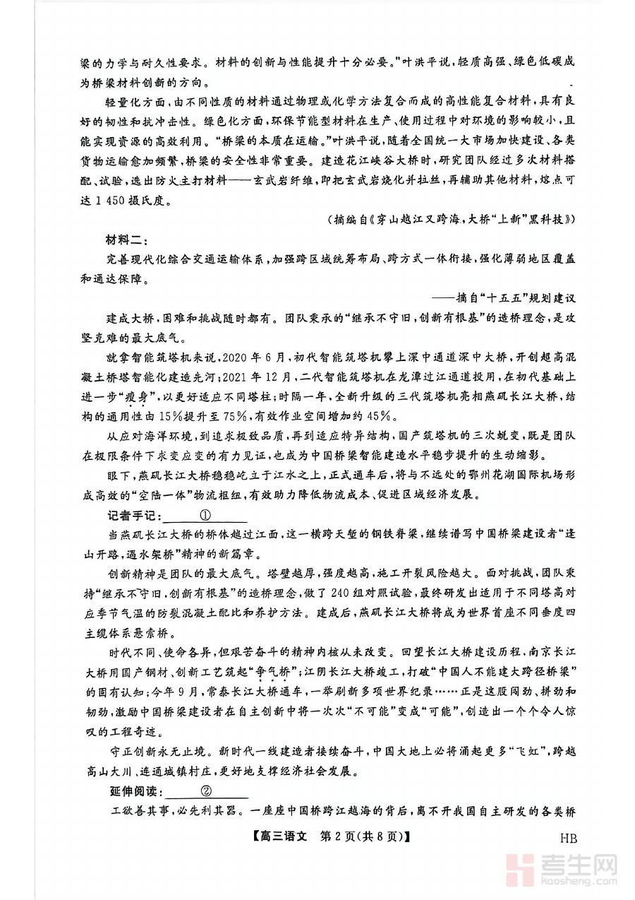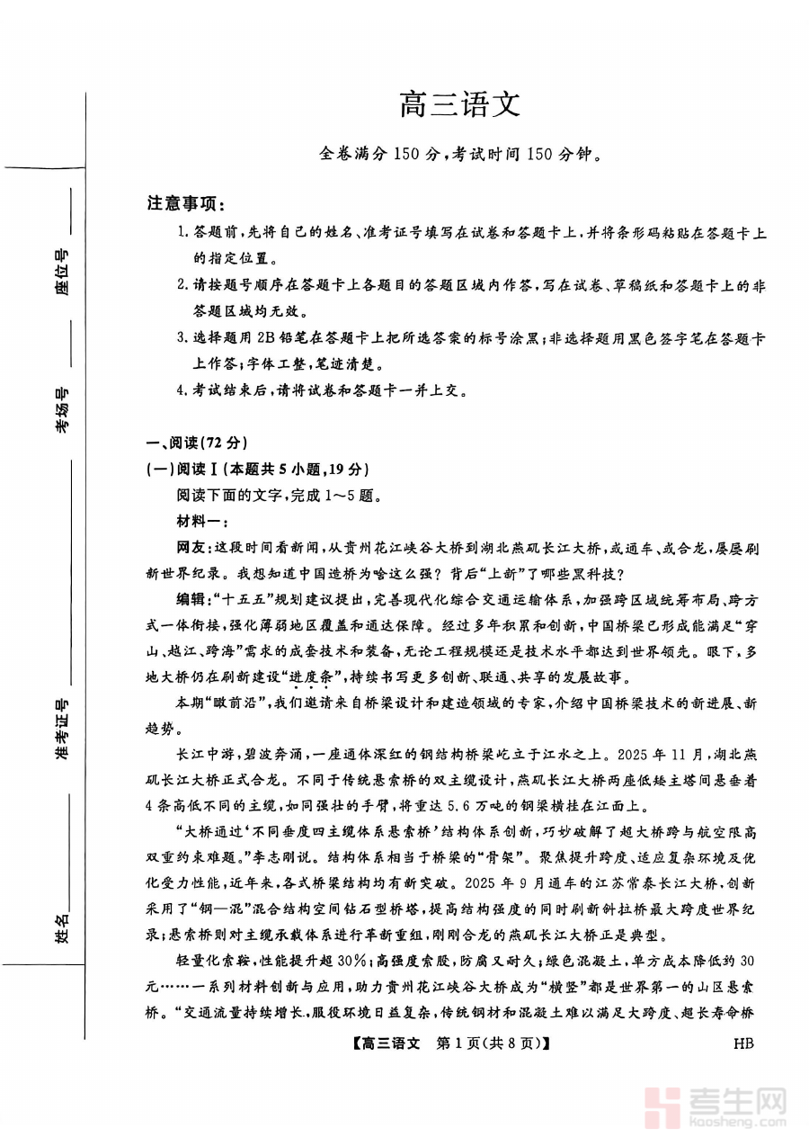 此试卷主要用于高三学生的阶段学情诊断与备考方向校准。通过完成试卷,学生可清晰了解自身语文学习的优势与不足,为后续的复习规划提供精准依据;教师则能借助试卷反馈的整体数据,把握班级整体学习状况,优化教学策略以适配联考及高考的备考需求,保障复习进度与质量。