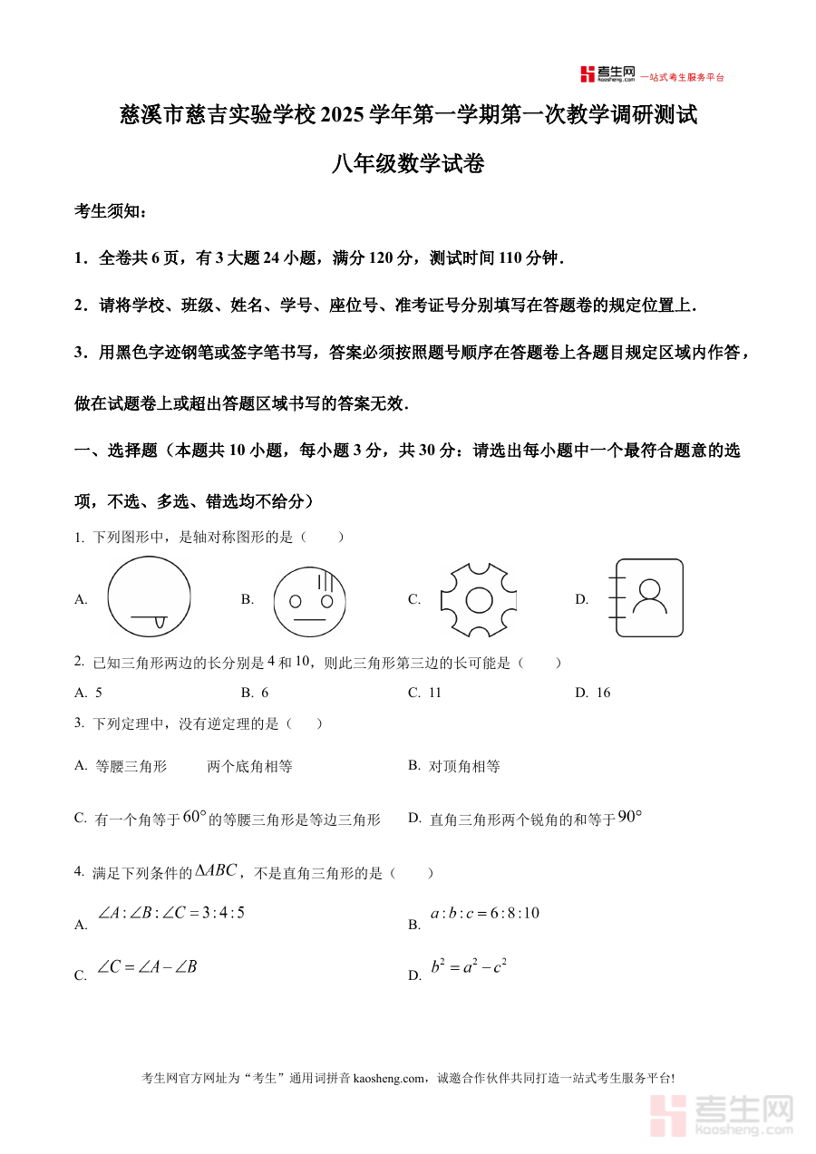 《精品解析:浙江省宁波慈溪市慈吉实验学校2025-2026学年上学期第一次月考八年级数学试卷(原卷版)》是针对浙江省宁波慈溪市慈吉实验学校2025-2026学年上学期八年级数学第一次月考的配套备考资料,聚焦该阶段学校数学学科的阶段性检测需求,为相关使用者提供与本校月考直接对应的原卷内容参考。
