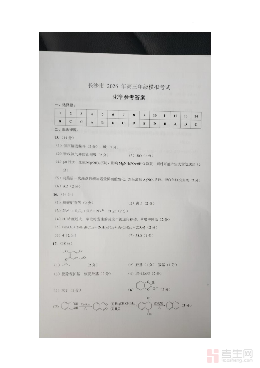 《湖南长沙2026届高三上学期模拟考试化学答案》是面向湖南省长沙市2026届高三学生推出的、对应上学期模拟考试化学科目的配套答案资料。该资料紧密贴合高三上学期的学习进度与模拟测试需求,作为该次化学模拟考试的标准解答参考,能够为考生及教学工作者提供明确的答题依据与评分方向。