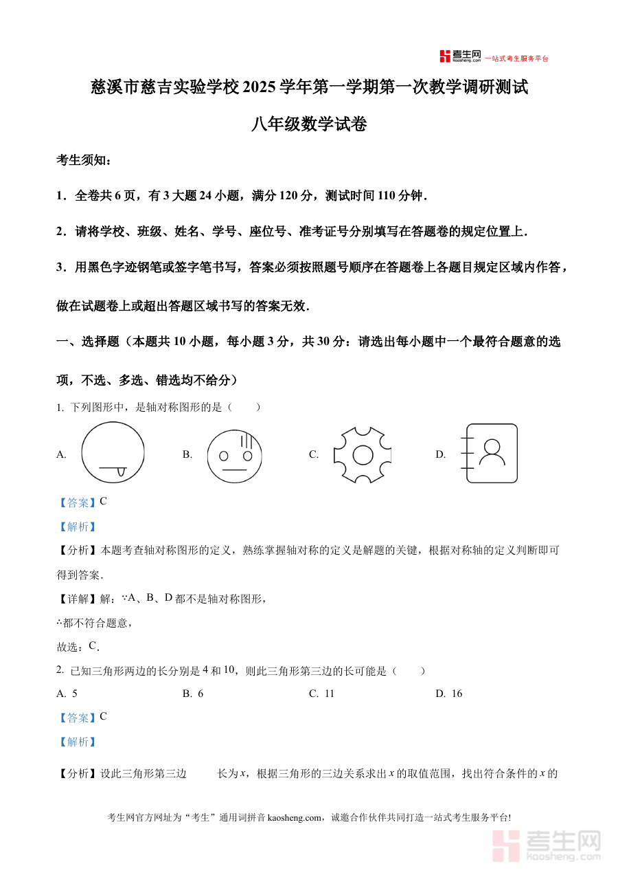 《精品解析:浙江省宁波慈溪市慈吉实验学校2025-2026学年上学期第一次月考八年级数学试卷(解析版)》是针对浙江省宁波慈溪市慈吉实验学校2025-2026学年上学期八年级数学第一次月考的专业备考资料,聚焦该阶段学校内部阶段性考试的核心需求,为对应场景下的使用者提供精准的考试内容解析支持。