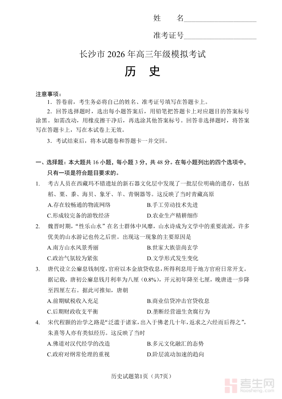 该资料的核心适用人群为2026届长沙市高三历史学科的学生及一线历史教师。对学生而言,通过完成此模拟试卷,可强化对历史知识的综合运用能力,熟悉考试流程与答题规范;对教师而言,可借助试卷的检测结果评估教学效果,优化教学计划与辅导方案,助力学生高效备战高考历史科目,实现阶段性复习目标。