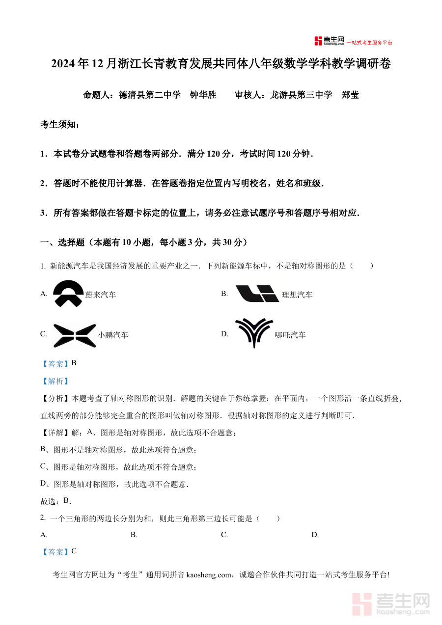 《精品解析:浙江省长青教育发展共同体2024--2025学年八年级数学学科教学调研卷(解析版)》是针对浙江省长青教育发展共同体在2024至2025学年开展的八年级数学教学调研活动所配套的解析类备考资料,精准对应该共同体范围内的阶段性教学检测需求。