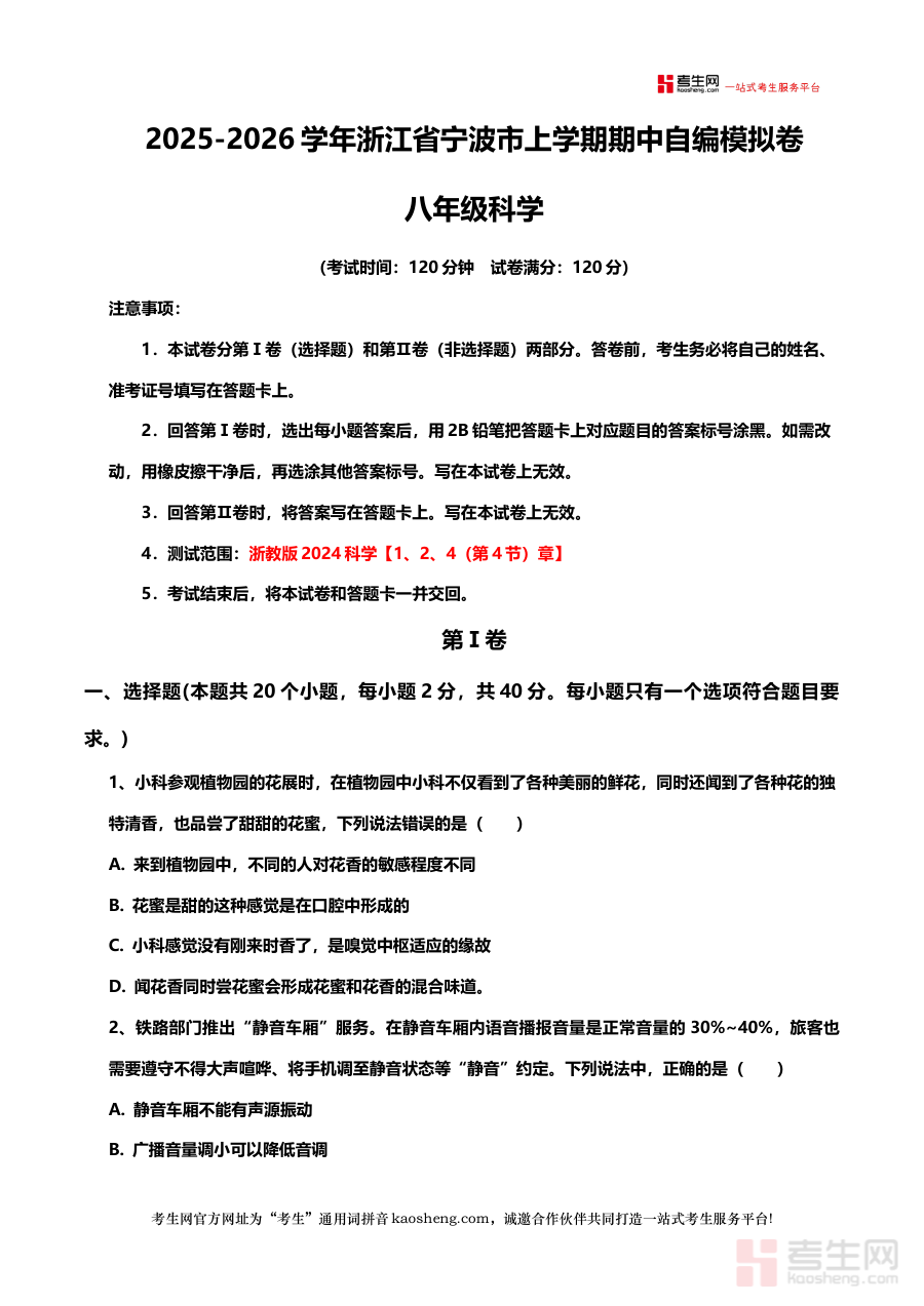 《浙江省宁波市八年级科学上学期期中自编模拟卷(原卷版)(新教材浙教版)》是面向浙江省宁波市八年级学生的科学学科期中备考资料,依托当地教学要求与浙教版新教材的知识框架,精准对接上学期期中阶段的检测目标。该资料以自编形式呈现,贴合宁波地区的教学实际情况,为师生提供符合本地考试导向的模拟练习资源,助力使用者提前适应期中考试的考察模式与内容范围。
