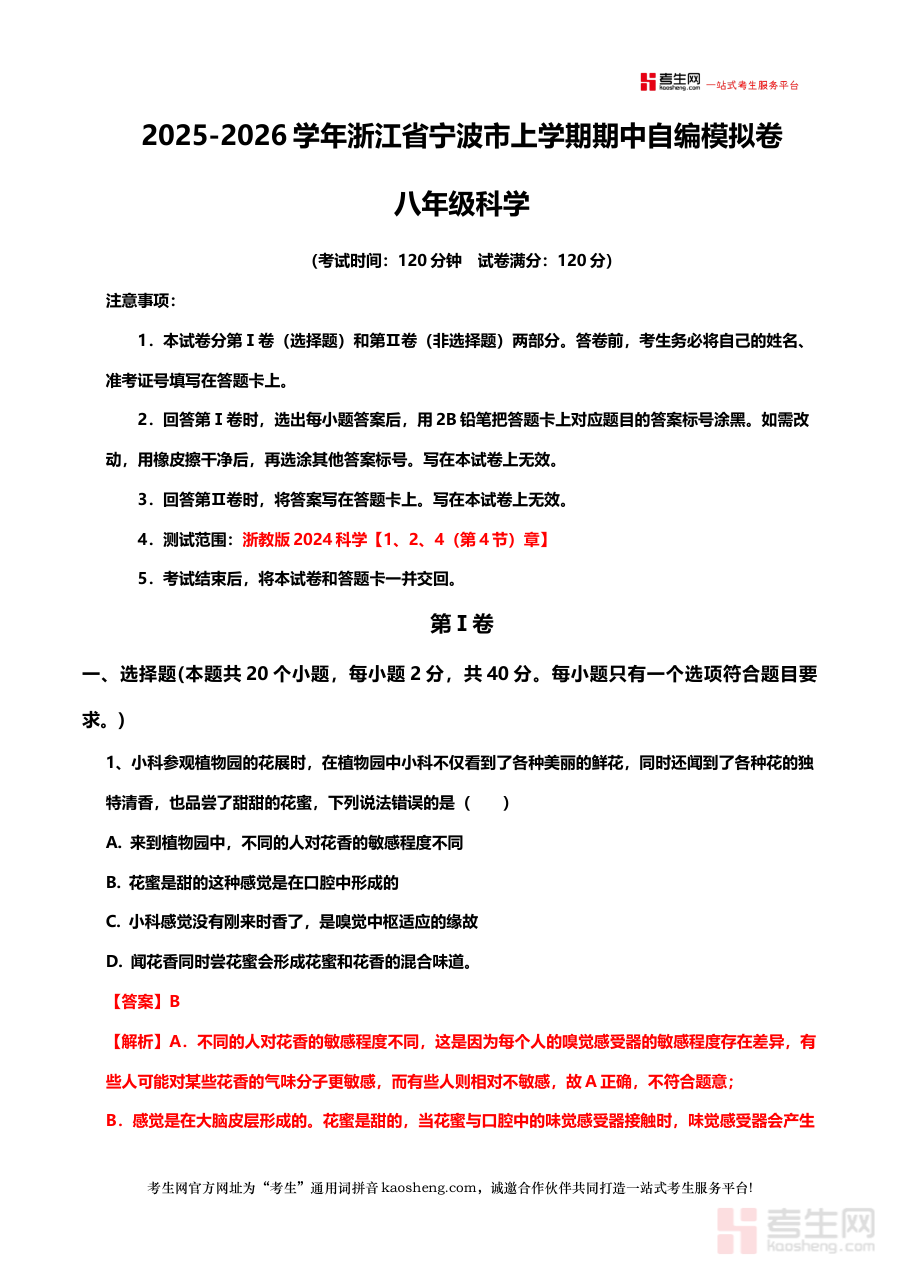 《浙江省宁波市八年级科学上学期期中自编模拟卷(解析版)(新教材浙教版)》是针对浙江省宁波市八年级学生上学期期中科学考试编制的模拟备考资料,其严格依据浙教版新教材内容框架编写,且配备详细解析板块,旨在为学生提供贴合当地教学进度与考试要求的练习载体,帮助学生提前熟悉期中测试的考查方向与形式特点。