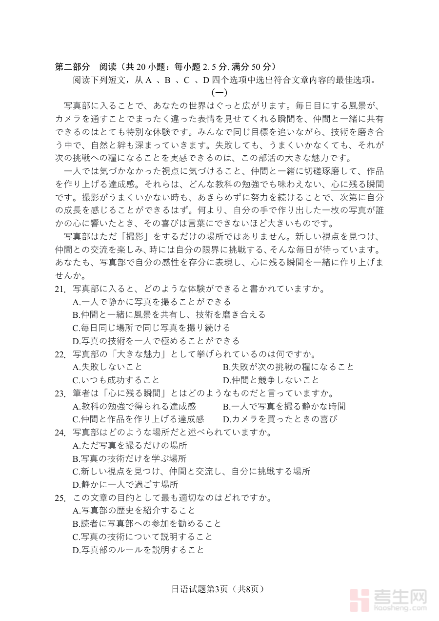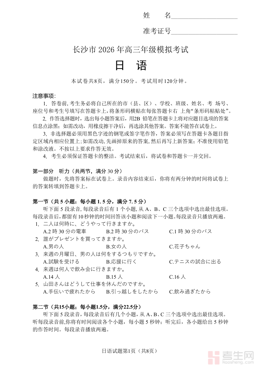《【日语试卷】长沙市2026年高三模拟考试》是针对长沙市2026届高三学生设计的日语学科模拟考试资料,结合了该地区高三日语教学的阶段性特点和考试要求,属于区域性的重要备考资源。它旨在为学生提供贴合本地教学实际的练习场景,帮助学生提前适应考试形式与节奏,是高三日语学习过程中不可或缺的阶段性训练材料。