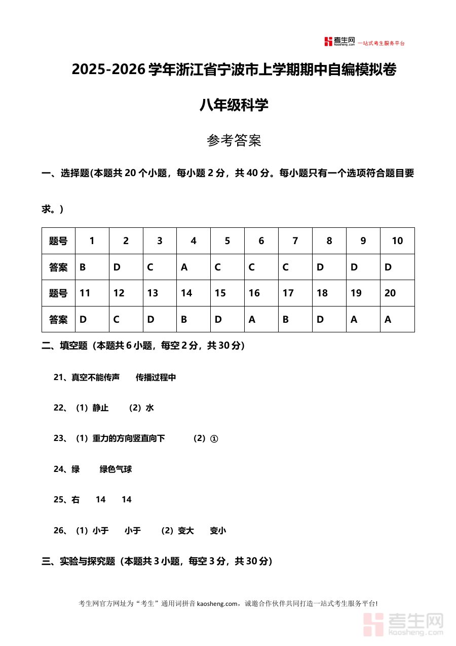 《浙江省宁波市八年级科学上学期期中自编模拟卷(评分标准)(新教材浙教版)》是针对浙江省宁波市区域内八年级学生设计的上学期期中阶段自编模拟类备考资料,其严格依据浙教版新教材的内容体系与教学要求编写,并配备了完整的评分标准,旨在为相关使用者提供贴合本地教学实际与期中考试考查方向的阶段性练习及评价资源,帮助使用者更好地对接区域内期中教学评价需求。