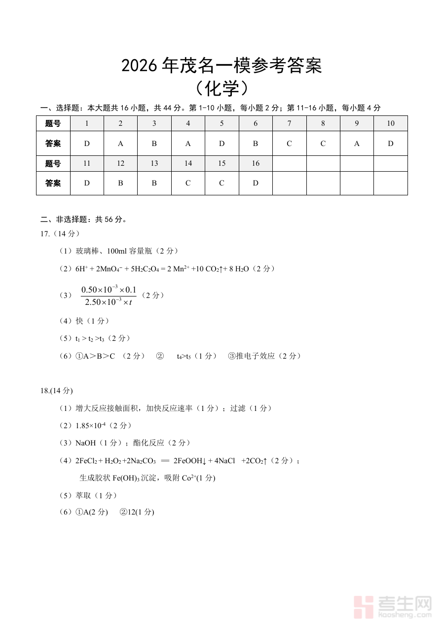 《2026届广东省茂名市高州市高三上学期一模化学答案》是针对2026届广东省茂名市高州市高三学生上学期第一次模拟考试化学科目的配套参考答案资料。该考试属于高三阶段重要的区域性模拟检测,旨在模拟高考化学科目的考查形式与难度,而这份答案则为该次考试提供了权威的评分依据和解题参考,是高三化学备考过程中的关键辅助材料之一。