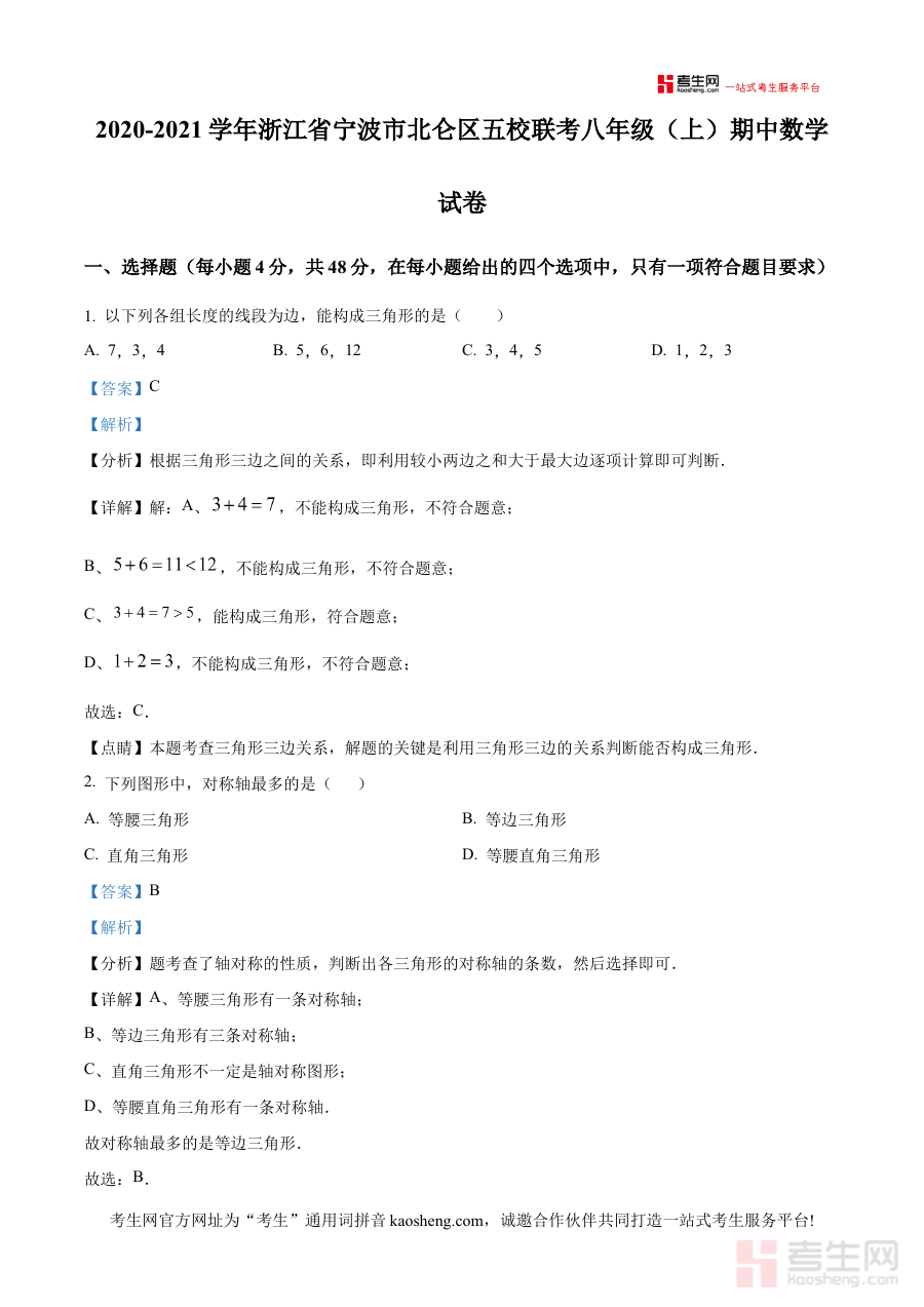 《精品解析:浙江省宁波市北仑区五校联考2020-2021学年八年级上学期期中数学试卷(解析版)》是针对浙江省宁波市北仑区五校联考2020-2021学年八年级上学期期中数学考试的专业备考资料,整合了该区域五校联合命题的期中数学试卷及对应解析内容,为使用者提供贴合当地教学实际的参考依据。