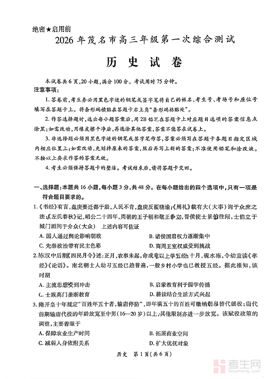 《2026届广东省茂名市高州市高三上学期一模历史试卷》是面向2026届广东省茂名市高州市高三学生的历史学科阶段性备考资料,明确对应高三上学期第一次模拟考试的时间节点与本地考试性质,贴合高州市及茂名市区域内的历史教学进度与考试要求,为学生提供符合本地备考方向的练习载体。