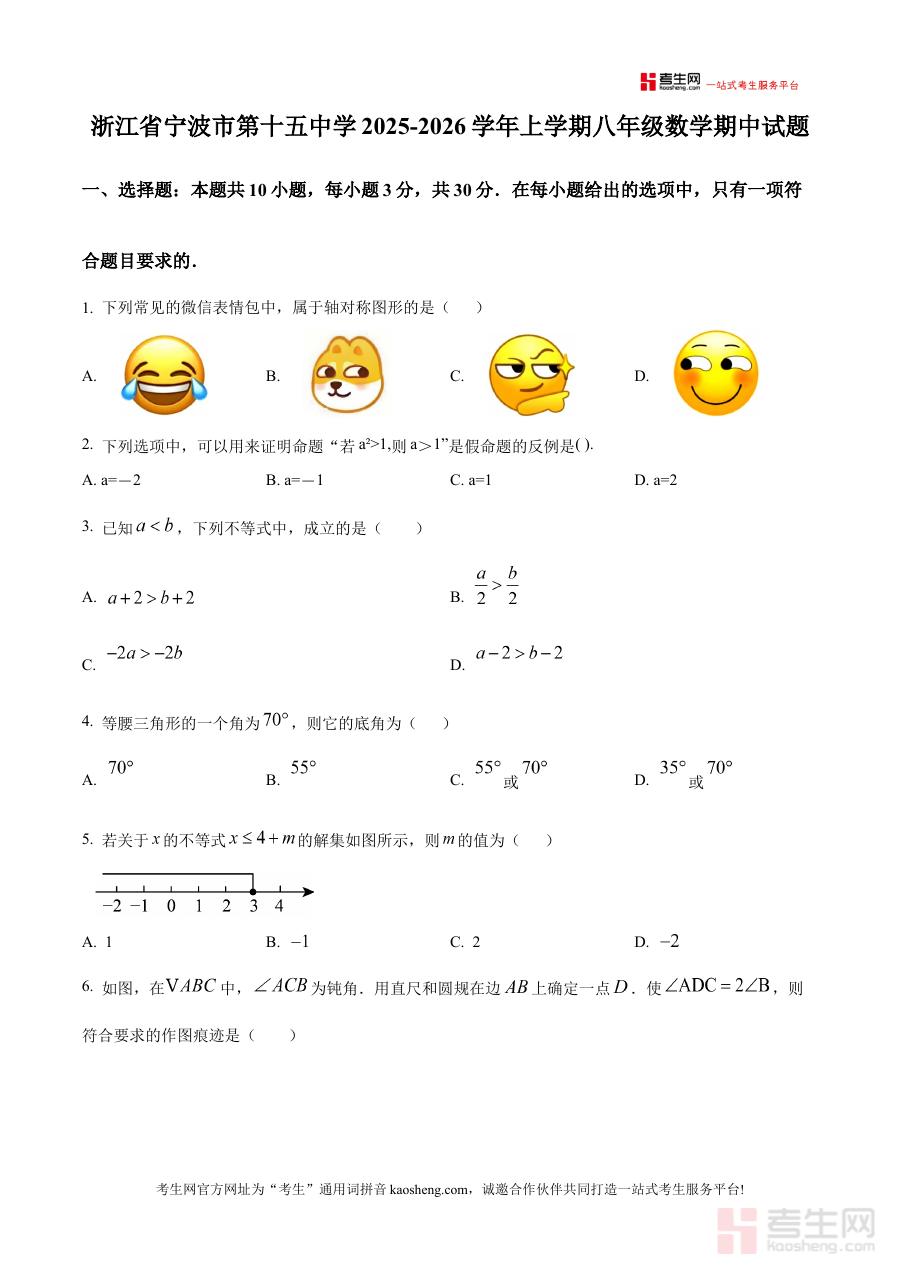 《精品解析:浙江省宁波市第十五中学2025-2026学年上学期八年级数学期中试题(原卷版)》是面向浙江省宁波市第十五中学特定学年学期的数学期中检测配套资料,精准对应2025至2026学年上学期八年级数学学科的期中考核场景,为该校师生及相关使用者提供与本校期中试题直接匹配的备考资源,助力提前熟悉期中检测的命题环境与形式特征。