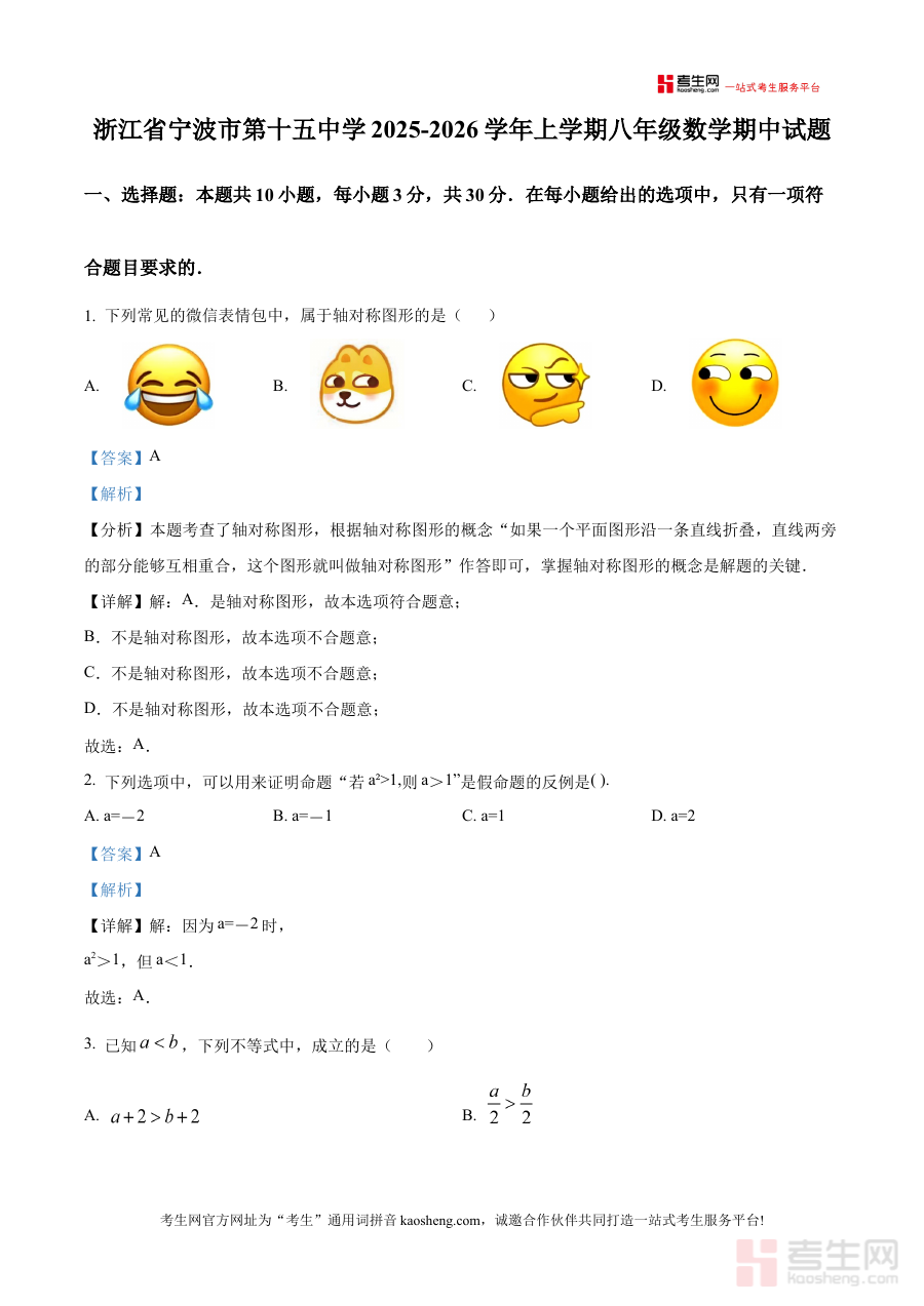 《精品解析:浙江省宁波市第十五中学2025-2026学年上学期八年级数学期中试题(解析版)》是针对浙江省宁波市第十五中学2025至2026学年上学期八年级数学期中考试的备考资料,聚焦该阶段数学学科的期中检测需求,为使用者提供与考试直接相关的解析内容支撑。
