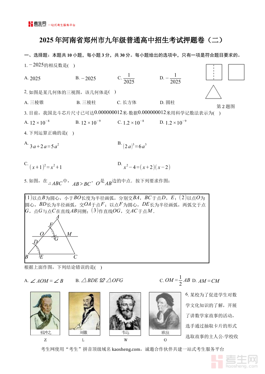 本资料主要适用于2025届河南省郑州市九年级全体学生,特别是正处于升学备考关键时期、需要系统提升应试能力的考生群体,通过使用该押题卷开展模拟练习,可加深对考试流程与题型结构的熟悉度,强化应试技巧与时间管理能力,为顺利通过普通高中招生考试奠定坚实基础。