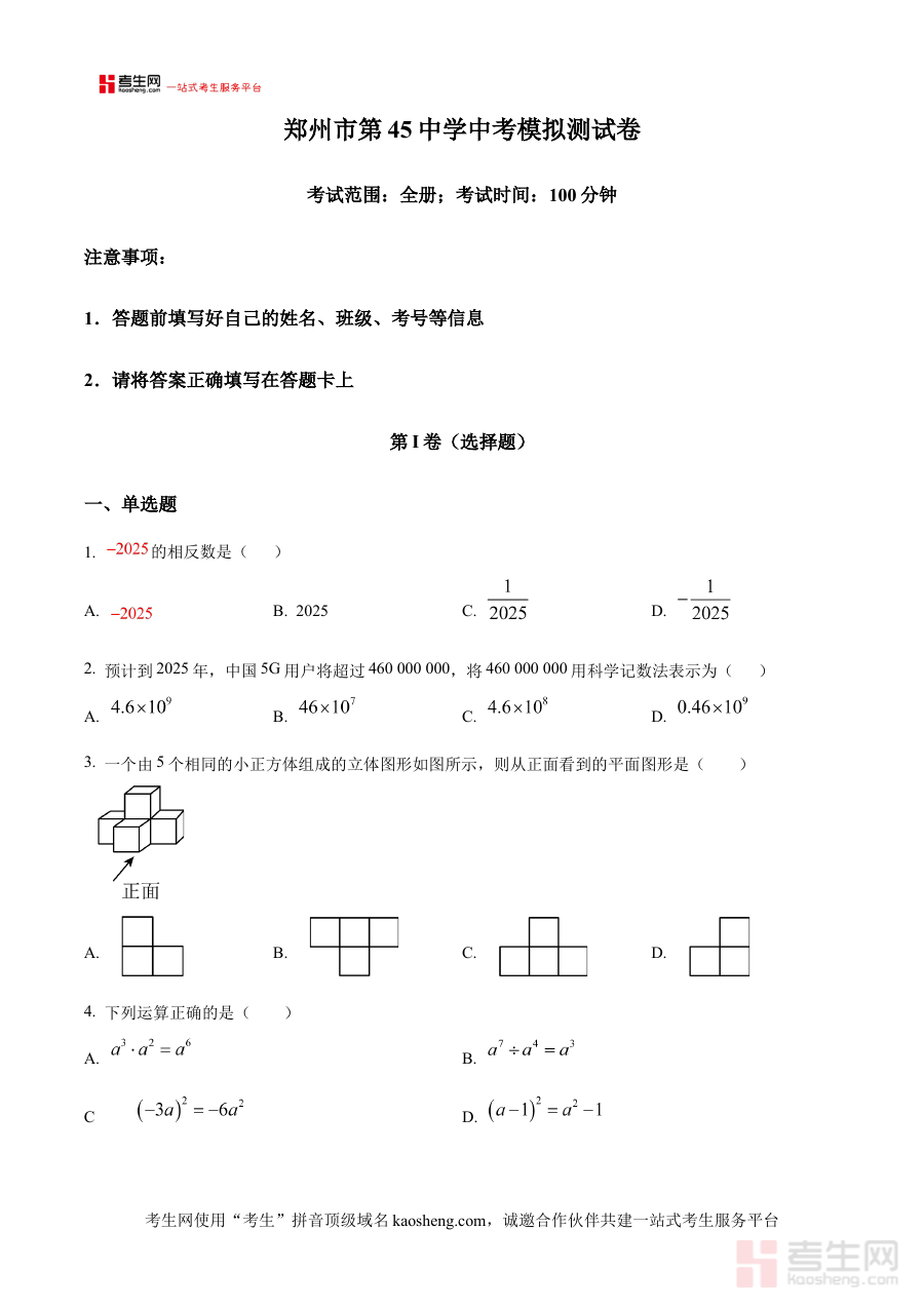 《精品解析:河南省郑州市管城区第45中学2024-2025学年下学期九年级中考数学模拟试题(原卷版)》是针对河南省郑州市管城区第45中学2024-2025学年下学期九年级学生设计的中考数学模拟备考资料,贴合该学年下学期的教学进度与中考备考阶段需求,为学生提供了符合本地教学实际的模拟练习载体。