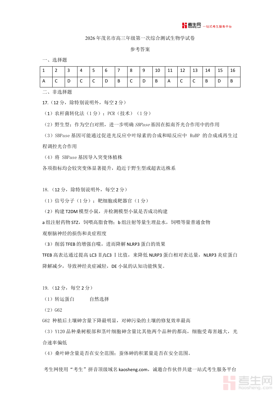 《2026年茂名市高三年级第一次综合测试生物学试卷参考答案》是2026年茂名市针对高三年级开展的首次生物学综合测试的配套资源,属于高三生物学阶段性备考资料范畴。该测试是高三学生进入系统复习阶段后的重要检测环节,参考答案作为其核心配套内容,为考生和教学者提供了权威的答题参考与评分依据,是衔接前期基础学习与后续针对性复习的关键辅助材料。