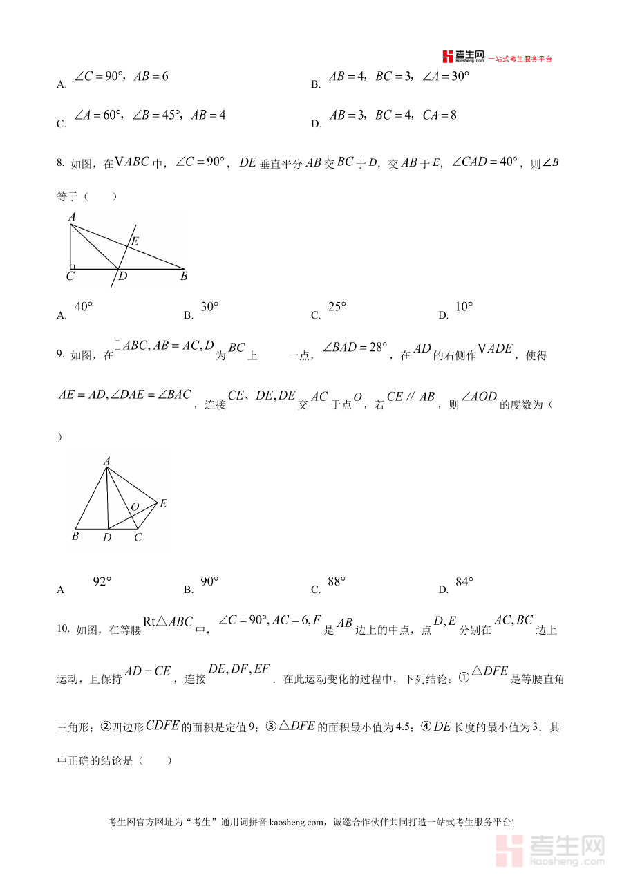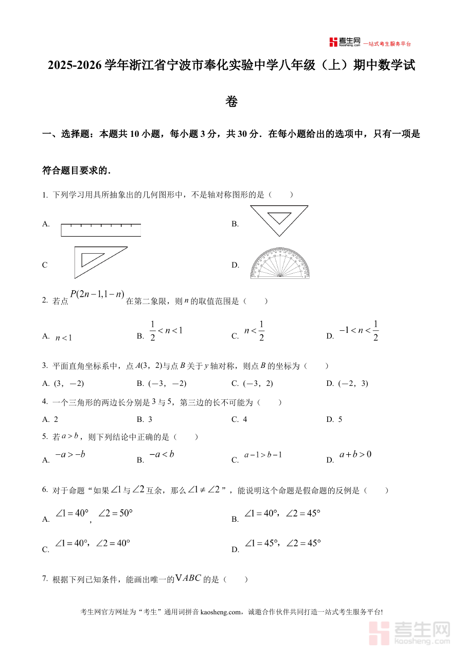 《精品解析:浙江省宁波市奉化实验中学2025-2026学年上学期八年级期中数学试卷(原卷版)》是针对浙江省宁波市奉化实验中学2025至2026学年上学期八年级期中数学考试的配套备考资料,明确对应特定学年、学期、年级及考试阶段,为相关教学与学习场景提供精准的资料支持。