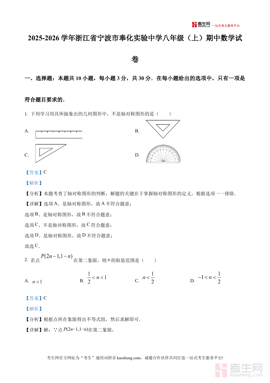 《精品解析:浙江省宁波市奉化实验中学2025-2026学年上学期八年级期中数学试卷(解析版)》是针对浙江省宁波市奉化实验中学2025-2026学年上学期八年级期中数学考试的专项备考资料,精准对应该学校该学年该阶段的数学期中检测需求,为相关学习者提供贴合实际考试场景的参考依据。