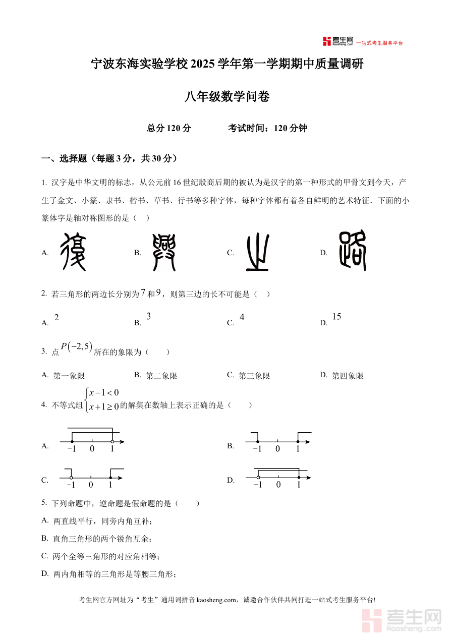 《精品解析:浙江省宁波市宁波东海实验学校2025-2026学年八年级上学期期中数学试卷(原卷版)》是针对浙江省宁波市宁波东海实验学校2025至2026学年八年级学生设计的期中数学考试配套资料,聚焦该学年上学期中期阶段的数学学科检测场景,为使用者提供与学校期中测试直接对应的原卷形式备考素材。