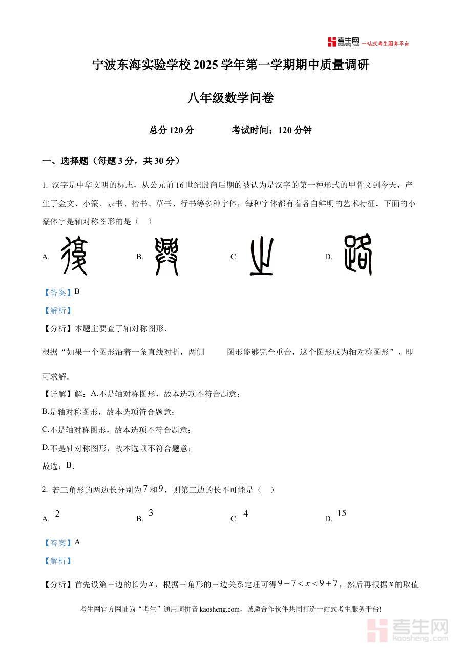 《精品解析:浙江省宁波市宁波东海实验学校2025-2026学年八年级上学期期中数学试卷(解析版)》是针对浙江省宁波市宁波东海实验学校2025-2026学年八年级上学期期中数学考试的专业备考资料。该资料紧密贴合学校该学年上学期的教学进度与期中检测目标编制,精准匹配八年级学生半学期学习后的知识巩固与能力评估需求,为学生提供与本校期中测试直接关联的系统性备考支持。