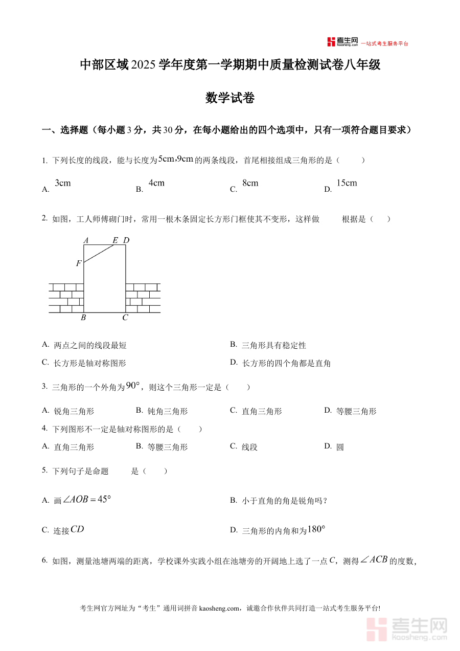 此资料适用于浙江省宁波市慈溪市中部区域的八年级学生、数学教师及学生家长,作为区域联考的原卷资料,能有效反映学生对已学知识的掌握程度,对后续备考规划具有重要参考价值,帮助使用者在期中考试前做好充分准备。