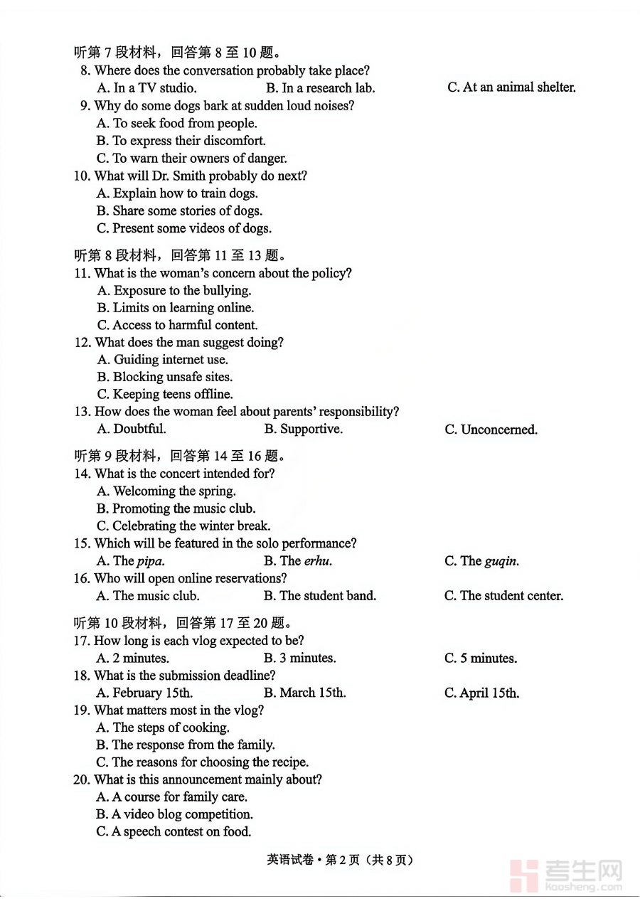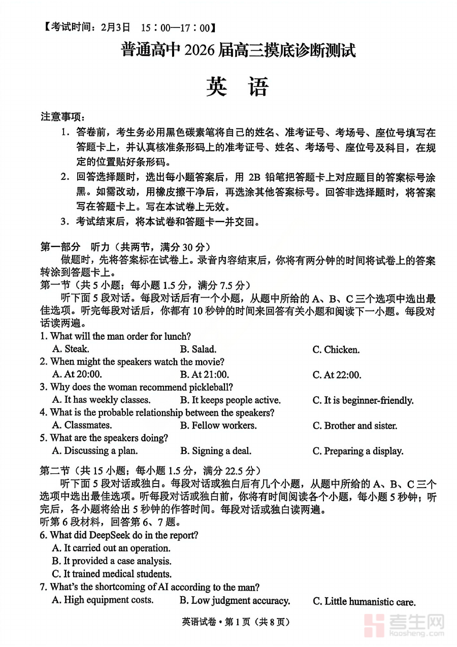 本试卷适用于2026届昆明市高三学生及从事高三英语教学的教师群体。对学生而言,参与该测试可熟悉市级统测的命题特点和考查重点,提前适应类似考试的节奏与要求;对教师而言,该试卷是分析学情、调整教学进度与内容的重要工具。其作为高三阶段检测的重要资料,能有效助力师生明确备考方向,为高考前的系统复习筑牢基础,是高三英语备考进程中不可或缺的阶段性支持材料。